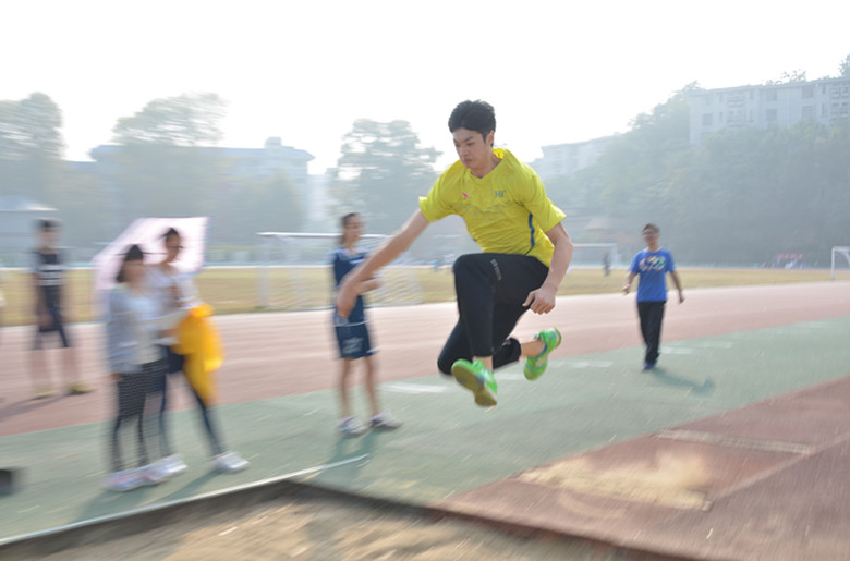 男子跳远比赛,助跑跳跃不停歇。
