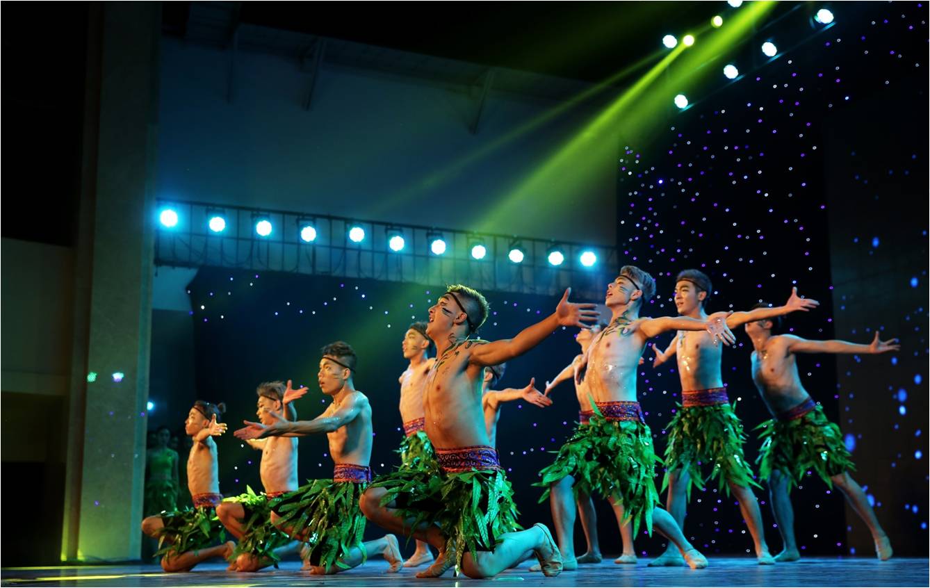 在舞蹈大赛中,我们参赛作品《吉祥树》以漫天闪亮的繁星为背景,以树叶作为衣物上的装饰,新闻院的出场吸引了很多观众的目光。为了节目效果,参加表演的男生全都裸着上身,他们踏着节奏感强劲的鼓点,开始舞蹈。整支舞蹈节奏多变,色彩明艳,借树木枝繁叶茂的形象体现出中华儿女与祖国血脉相连的骨肉情,男女舞者以绚丽的舞姿,为祖国送出一树吉祥。