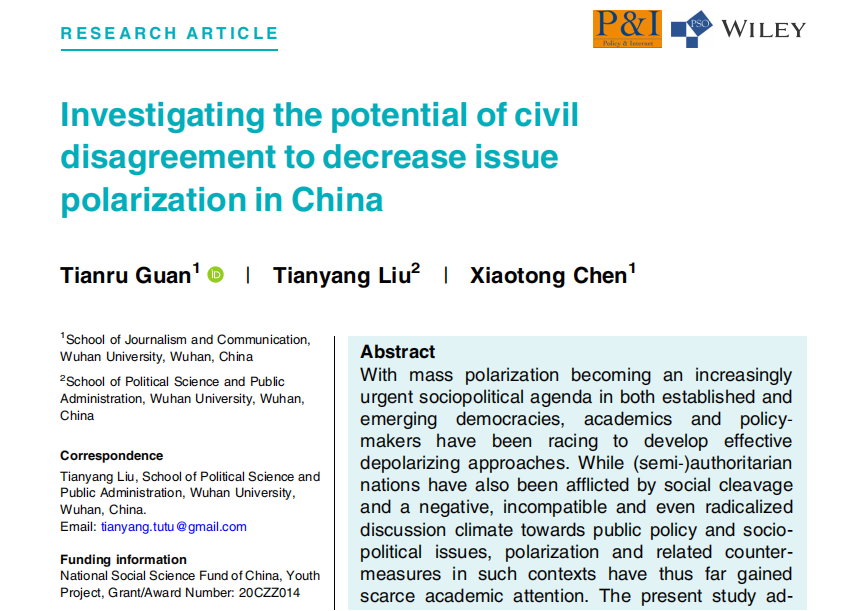 第六届青年新媒体学术研究“启皓奖”评选结果近日揭晓,我们关天如副教授发表于 Policy & Internet(SSCI期刊,JCR Q1,影响因子:3.6)的论文Investigating the Potential of Civil Disagreement to Decrease Issue Polarization in China(《微博语境下探究理性分歧在网络空间中的去极化潜力》)荣获本届“启皓奖”卓越学术奖。Policy & Internet 是政治传播与数字治理领域具有国际影响力的英文顶级期刊,在2025年中国科学院期刊分区中传播学学科排名第6位(共223种期刊),被列为文学大类一区Top期刊。该论文自2023年发表以来入选出版方Wiley年度“十佳高被引论文”,充分体现了研究成果的国际影响力与学术价值。